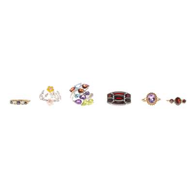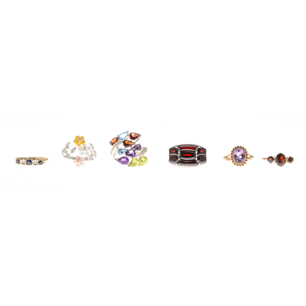 to include a contemporary garnet set cluster ring, with small round brilliant cut diamond detail to sides, to unmarked white metal shank; a 9ct gold amethyst set ring; a 9ct gold three stone garnet set ring, silver and coloured gem set ring, a 9ct gold sapphire and diamond set ring, a 18ct gold floral cluster set ring (6)