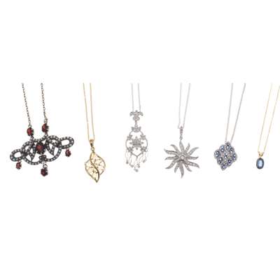 to include 9ct gold opal set pendant, to a trace link chain; a single stone sapphire set pendant, stamped 14k; a 18ct gold sapphire and diamond cluster pendant, to a trace link chain; an 18ct white gold and diamond set cluster pendant, to a trace link chain; a diamond set pendant with fringed detail, stamped 18k, to a trace link chain; a garnet and seed pearl set pendant (6)