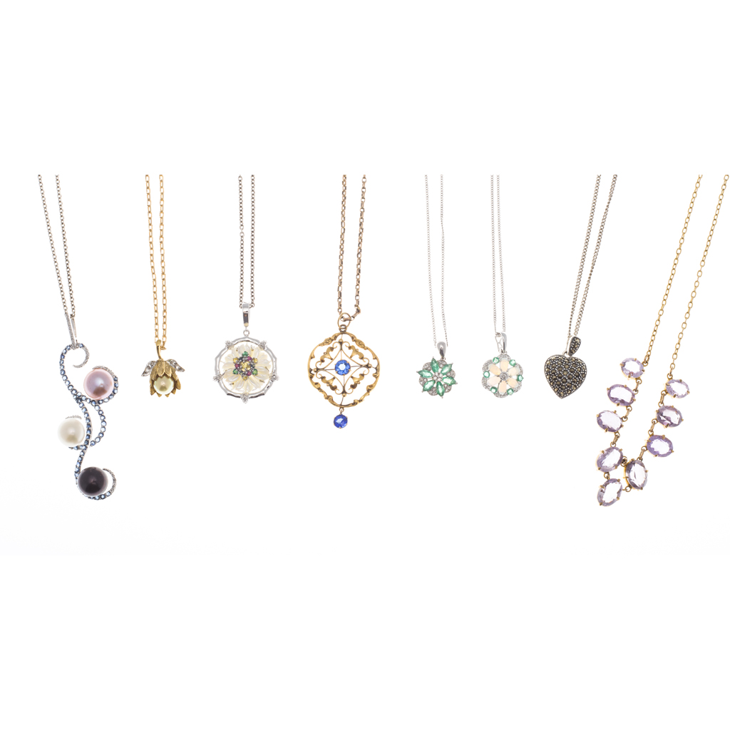 to include an opal, emerald and diamond set cluster pendant, stamped 750, to a 9ct gold trace link chain; an emerald and diamond set cluster pendant, stamped 750, to an 18ct gold trace link chain; an amethyst set necklace, stamped 375; an art nouveau style pendant set with blue paste; and various silver and gem set pendant necklaces (8)