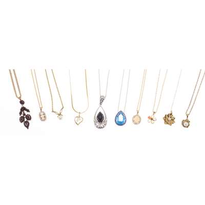 to include an 18ct gold opal and diamond set pendant, to a trace link chain; a 9ct gold multi-gem set pendant necklace, to a fancy link chain; a 9ct gold opal and gem set necklace, to a trace link chain; a 9ct gold pearl set pendant and chain, various other gem set pendants and chains (qty)