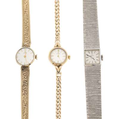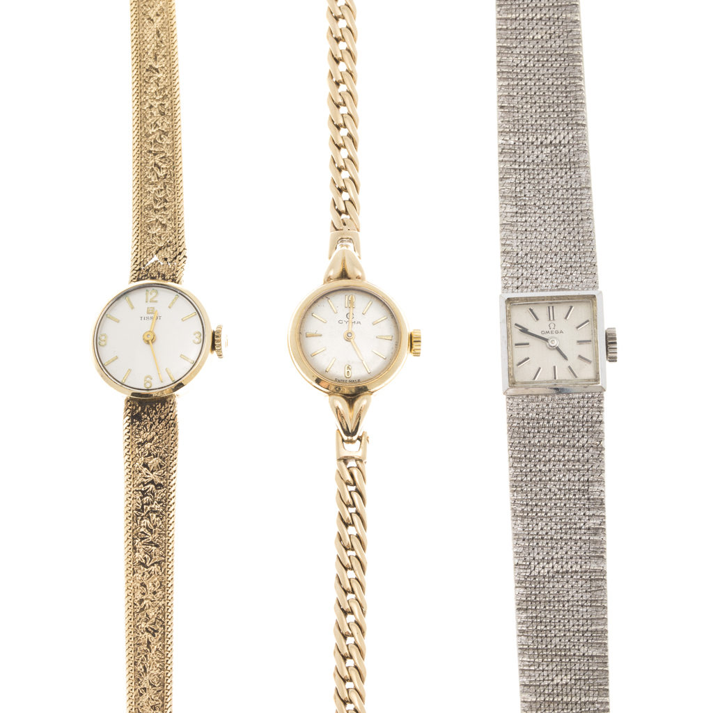 to include a 9ct gold Tissot watch, circular dial, integral woven bracelet, fold over clasp; a 9ct gold Omega wrist watch, circular dial, integral curb link bracelet, fold over clasp; a 9ct white gold Omega watch, square dial, integral woven bracelet, fold over clasp (3)