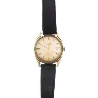 C8541b, plain 18ct gold case, gilt dial with date aperture, sweep second hand, baton indicators, automatic movement, leather strap