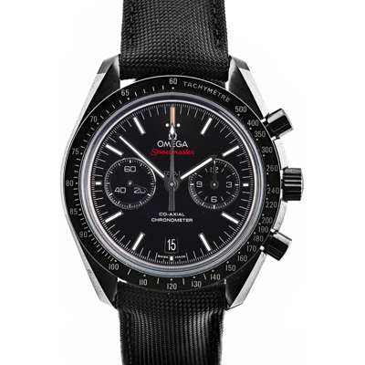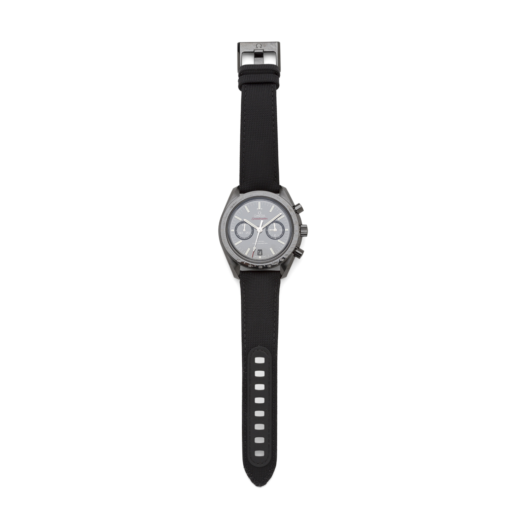 Speedmaster Co Axial Chronometer- Dark Side of the Moon, black polished and brushed zirconium oxide ceramic case, with a matt black ceramic dial and a black ceramic clasp on a black coated nylon fabric strap, brushed blackened Moonwatch-style hands and blackened applied indexes - coated with black Super-LumiNova, the sub-dials also matt black and the black ceramic bezel has a black lacquered tachymeter scale, Co-Axial calibre 9300 movement, with boxes, papers etc.