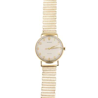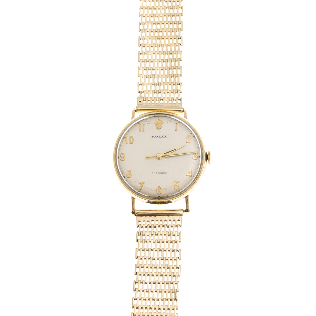 the circular dial with gilt Arabic numerals and hands, signed ROLEX PRECISION, fitted to a woven unmarked yellow metal flexible link bracelet marked CLD