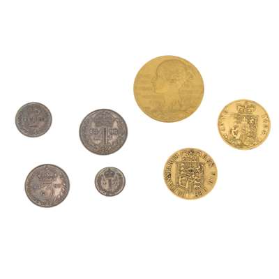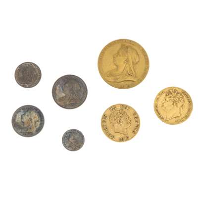 to include 1898 cased Maundy set, a cased Queen Victoria diamond jubilee gold medal; an 1824 half sovereign, and an 1817 half sovereign (4)