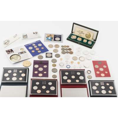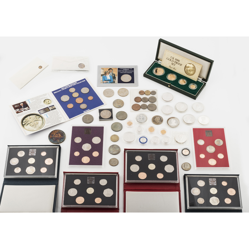 to include: 1980 gold four piece coin set £5 down; 1980 two proof half sovereigns; 1979 proof half sovereign; 1980 proof sovereign; 1981 proof silver Charles and Diana crown; two 1985 proof silver Piedfort £1s; 1982 Piedfort proof 20np; proof silver jubilee crown; proof silver gilt large medal 25th anniversary of the coronation of QEII; 1984 proof silver £1 coin; three 1951 proof crowns; proof coin collections in plastic cases - 1984, 1985, 1984, 1985, other boxed sets - 1981, 1980, 1984; a cased set of seven silver proof crowns relating to The Queen Mother's 80th birthday; various other proof crowns and coins (qty)