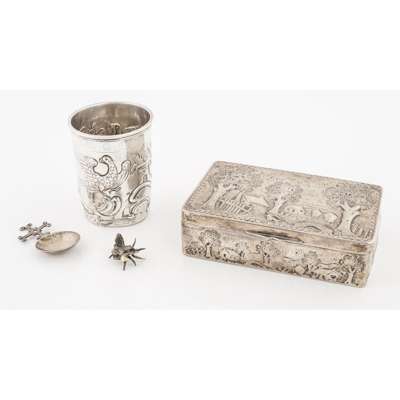 Moscow 1882, of tapering form, decorated birds: a Dutch style table box, marks rubbed circa 1800, decorated with a country landscape, a small Scottish caddy spoon and a modern silver gilt bee (4)