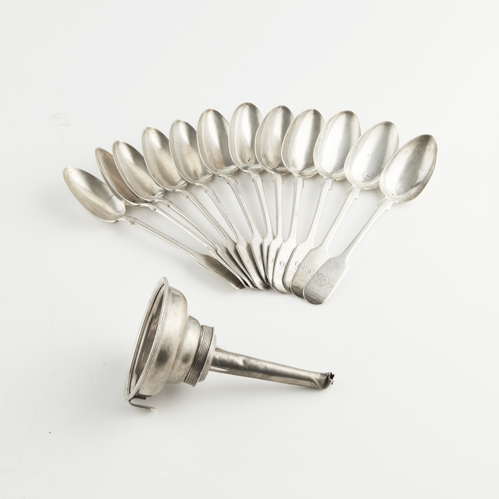 J.S retailed by West, Dublin 1875, of Fiddle pattern, engraved initials, together with a Geo III Scottish silver wine funnel a/f (12)