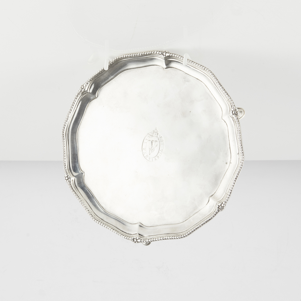 JL?, Dublin circa 1770, of gadroon border, moulded rim, engraved flat with later crest and motto, all on three short legs, hoof feet