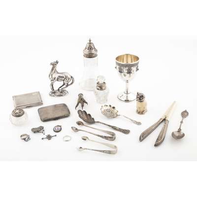 Lorne McKean, London 1975, cast by John Pinches, on behalf of The Horse Society; together with various items, a Kiddush cup, unmarked, applied wire work and onset lapis cabochons, simple stem, spreading base; a small glass pepperette, the glass body modelled as a seated cat, pull off silver head, well modelled; various flatware, glove stretchers; cigarette case etc