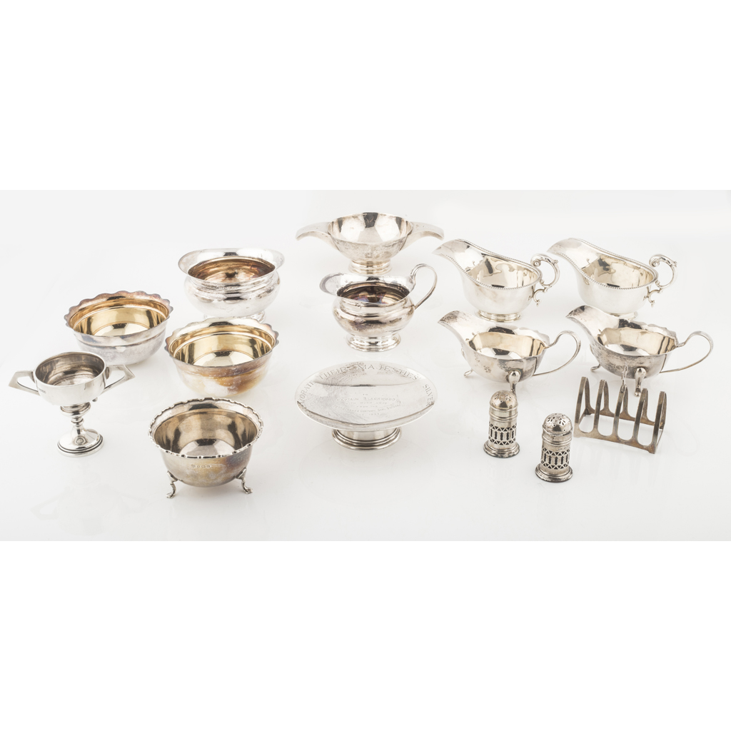 to include; five sauce boats, various marks and makers, a pair of scalloped edge bowls, a similar raised bowl on three feet, a quaich, a two handled cup, cruet, a shallow footed dish, sugar bowl, toast rack (16)
