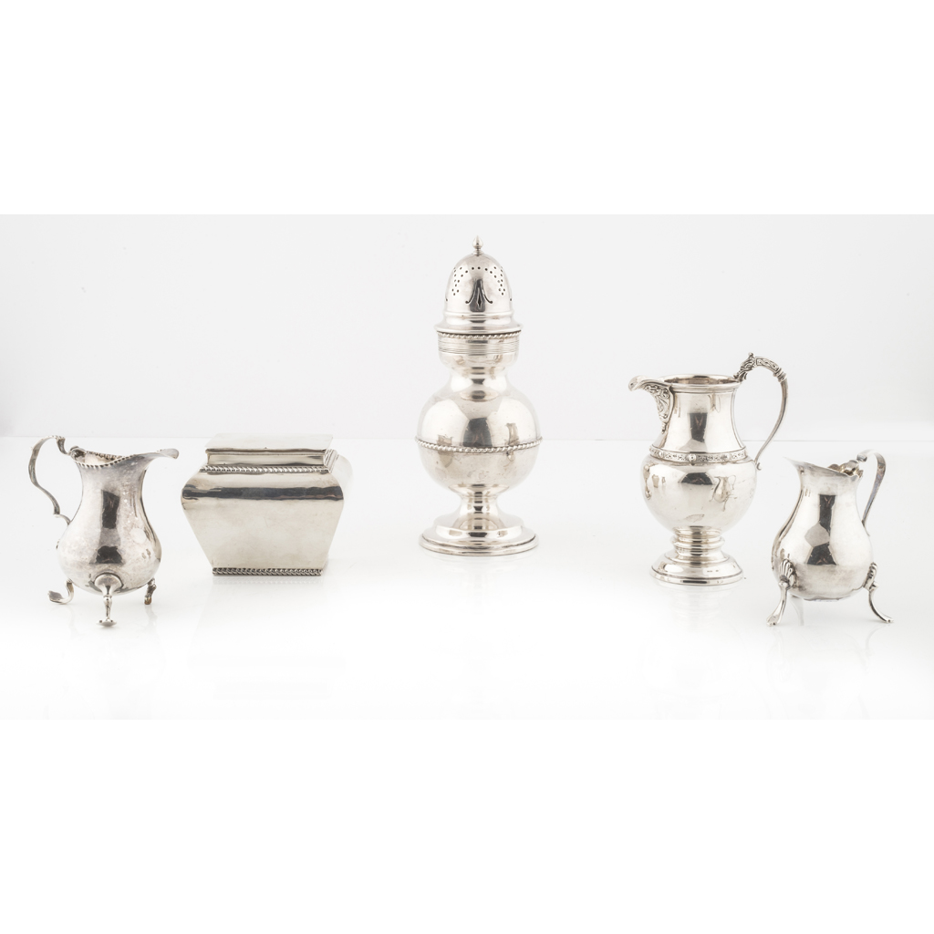 to include; a caster, Henry Atkins, Birmingham 1942, of baluster form, domed and pierced pull off lid gadroon border to body and lid, raised on a stepped spreading foot; together with a tea caddy, Mappin & Webb, London 1906 of rectangular form, gadroon border, and three cream jugs, various makers and dates (5)