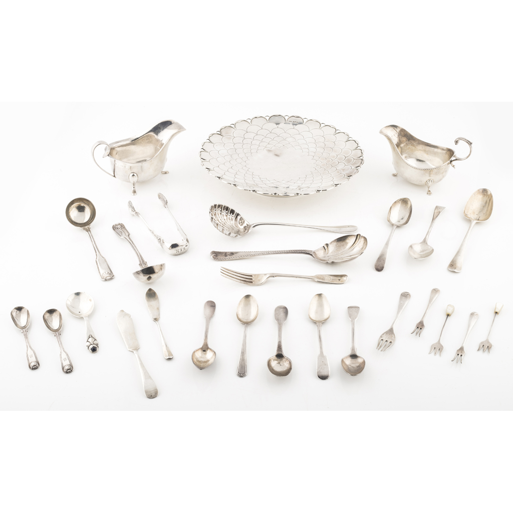 Mappin & Webb, Sheffield 1934, of scalloped circular form, graduated scale detail, vacant centre all raised on a spreading foot; together with two sauce boats, various makers and marks, and a collection of miscellaneous flatware (qty)