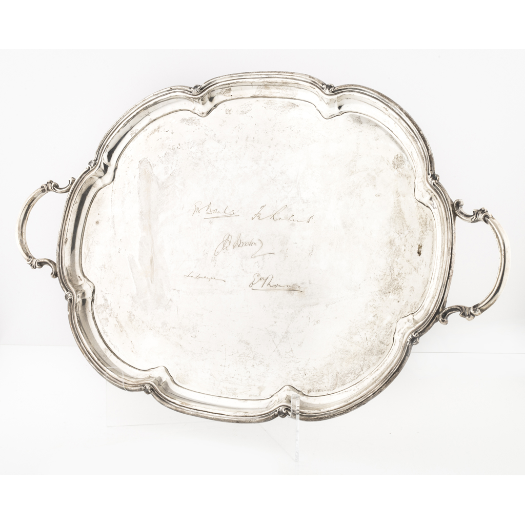 Garrard & Co., London 1926, of shaped oval form, raised border with facsimile signatures to centre, cast decorated handles