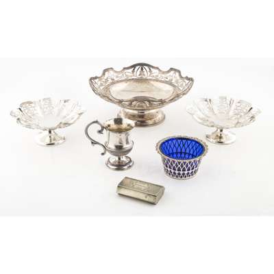 to include; a shallow footed bowl, Martin Hall & Co Ltd, Sheffield 1917, a similar smaller pair, Robert Stewart, Sheffield 1933, a one handled cup, an unmarked basket with blue glass liner; together with an unmarked snuff box (6)