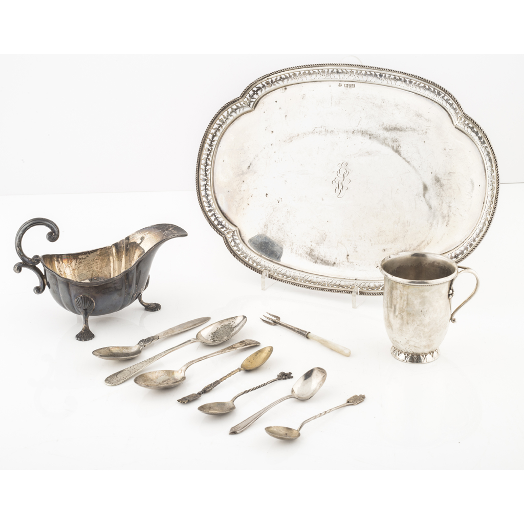 marked GEORG JENSEN, sterling, Denmark and with London import marks, C scroll handle with fruiting detail, beaded rim, raised on a spreading foot with scalloped detail; a spoon, marks for Georg Jensen, Denmark, STERLING SILVER, of cactus pattern; together with a tray, George Edward & Sons, Chester 1917, of quatrefoil form, raised pierced border with engraved initials to centre, a sauce boat, C.R., London 1861; together with a collection of spoons (qty)