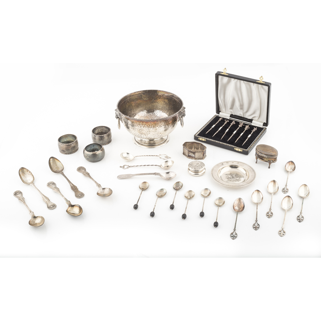 Walker & Hall, Sheffield 1913, of circular form, planished throughout, cast lion head lugs with loop handles, raised on a spreading foot; together with a cased set of cherry sticks, Bishton's Ltd., Birmingham 1966, the finials modelled as characters from Dickens' novels with twisted stems; a pin tray C J Vander Ltd, London 1970; together with four napkin rings; a patch box, a pill box, two Isle of Mull silver spoons and a collection of teaspoons (qty)
