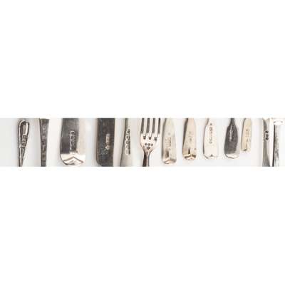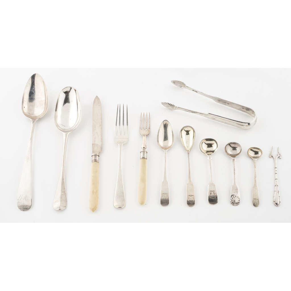 A. Henderson, Edinburgh 1807, of Old English pattern, pointed bowl, McG engraved on terminal in italics together with eighteen dessert forks, FH London 1820, of Old English pattern; twelve fiddle pattern teaspoons; six matching egg spoons; various condiment spoons; sugar tongs etc. all engraved crest of winged stirrup; together with nine fruit knives and forks, silver blades and tines, and two tablespoons (qty)