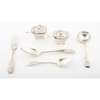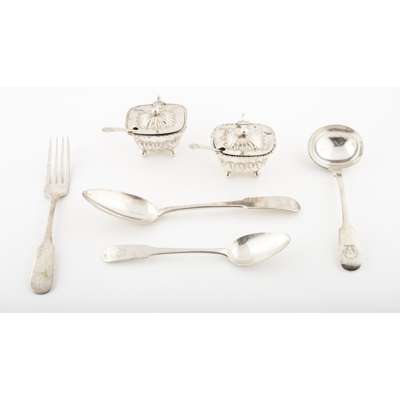 John Zeigler, Edinburgh 1808, comprising twelve table spoons, twelve table forks, twelve dessert spoons, all of fiddle pattern, crest to terminal, individually numbered to terminal in italics; together with two plated sauce ladles of the same design, and a pair of salts Henry Atkins, Birmingham 1878 (36)
