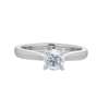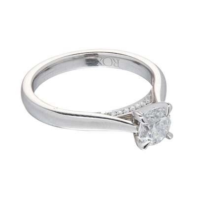claw set with a single round brilliant cut diamond, the gallery set with smaller round brilliant cut diamonds, to a plain platinum shank; together with an accompanying report by the GIA, dated 12.05.17, numbered 7202013189, stating that the diamond is 0.71cts, SI2 clarity, E colour