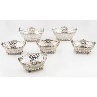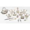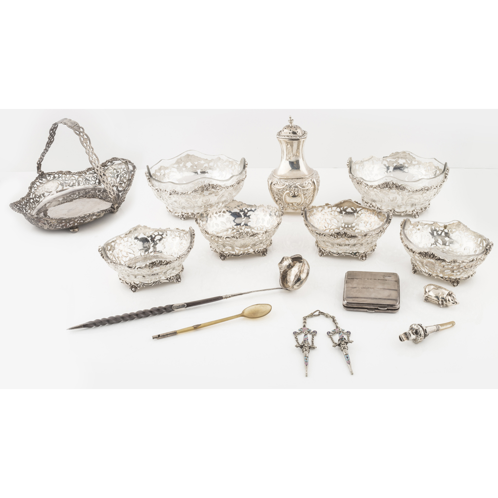 Charles Stuart Harris, London 1902 and 1901, the group of four smaller, moulded border, pierced floral body, raised on four bracket feet, crest engraved to front (one glass liner missing) with a larger similar pair both with glass liners, together with; a sugar caster, punch ladle, whistle spoon, novelty pig shaped tooth pick case, cigarette case, a silver accessory with scissors and child's rattle, (qty)