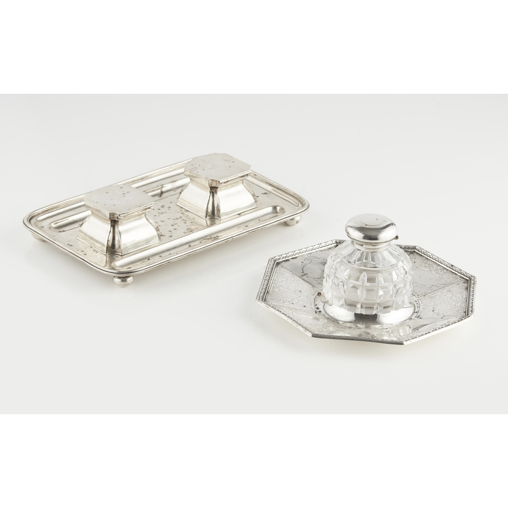 HW, London 1867, of octagonal form, cast border, the angled panels with trailing foliage, central silver topped inkwell, the other Chester 1929, of rounded rectangular form, two recessed pen trays, two lidded inkwells with hinged lids (3)