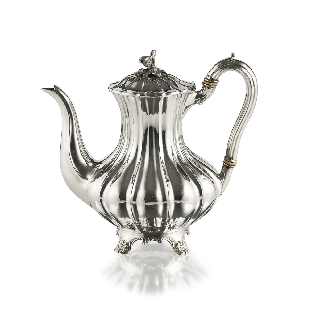 Richard Pearce & George Burrows, London 1835, of panelled baluster form with S scroll handle, a foliate finial, raised on cast foliate bracket feet
