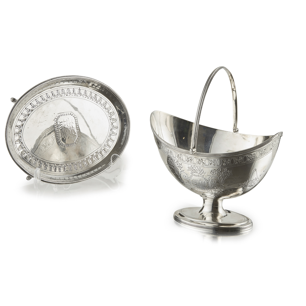 the sugar bowl by H Chawner, London 1790, of oval outline with engraved border of floral garlands and displays with reeded handle and on pedestal foot; together with a similar oval teapot stand, H Bateman (possibly) London 1789, engraved with acanthus border and central cartouche (2)