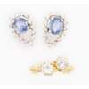 claw set with two round brilliant cut diamonds, to a plain shank stamped 750; together with a pair of sapphire and diamond set cluster earrings, to post and butterfly fittings (2)