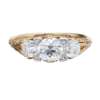 claw set with an old round cut diamond, flanked to either side by a smaller old round cut diamond, with diamond chip detail, scrolling detail to gallery, stamped 18