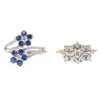 claw set with three baguette cut diamonds, in a border of round brilliant cut diamonds, to a plain 18ct gold shank; together with a sapphire and diamond set cluster ring, composed of two clusters of round brilliant cut sapphires, and a central diamond, to diamond set split shoulders, stamped 750 (2)