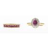 the first claw set with an oval cut ruby in a border of round brilliant cut diamonds, to a plain 18ct gold shank; together with a seven stone ruby ring, to a plain unmarked yellow metal shank (2)
