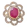 collet set with an oval cut ruby, in a floral surround set with rose cut diamonds, to a plain yellow metal shank, with Russian marks