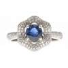 claw set with a round cut sapphire, in an open scrolling floral border pave set with three rows of small round brilliant cut diamonds, each shoulder similarly set, to a plain shank