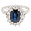 claw set with an oval-cut sapphire, in a border of round brilliant-cut diamonds, to a plain 18ct white gold shank