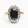 claw set with an oval cut sapphire, in a border of round brilliant cut diamonds, to a plain yellow metal shank stamped 18ct