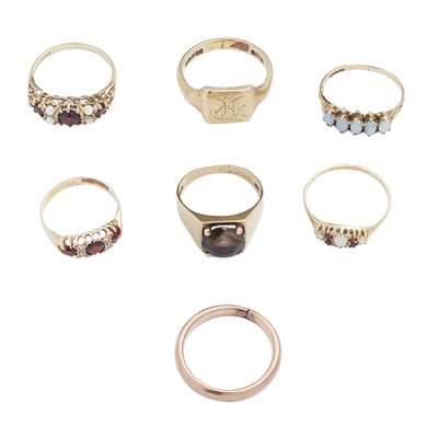 to include a single stone smokey quartz set ring, a five stone opal set ring; an opal and garnet set ring, a pearl and garnet and a diamond and garnet set ring, a gentleman's signet ring and a rose gold set wedding band (7)