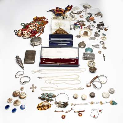 to include various beaded necklaces, costume brooches, bangles, rings etc. wrist watches, enamelled buttons, cultured and faux pearl necklaces, coins, silver cigarette cases, snuff boxes etc. (qty)
