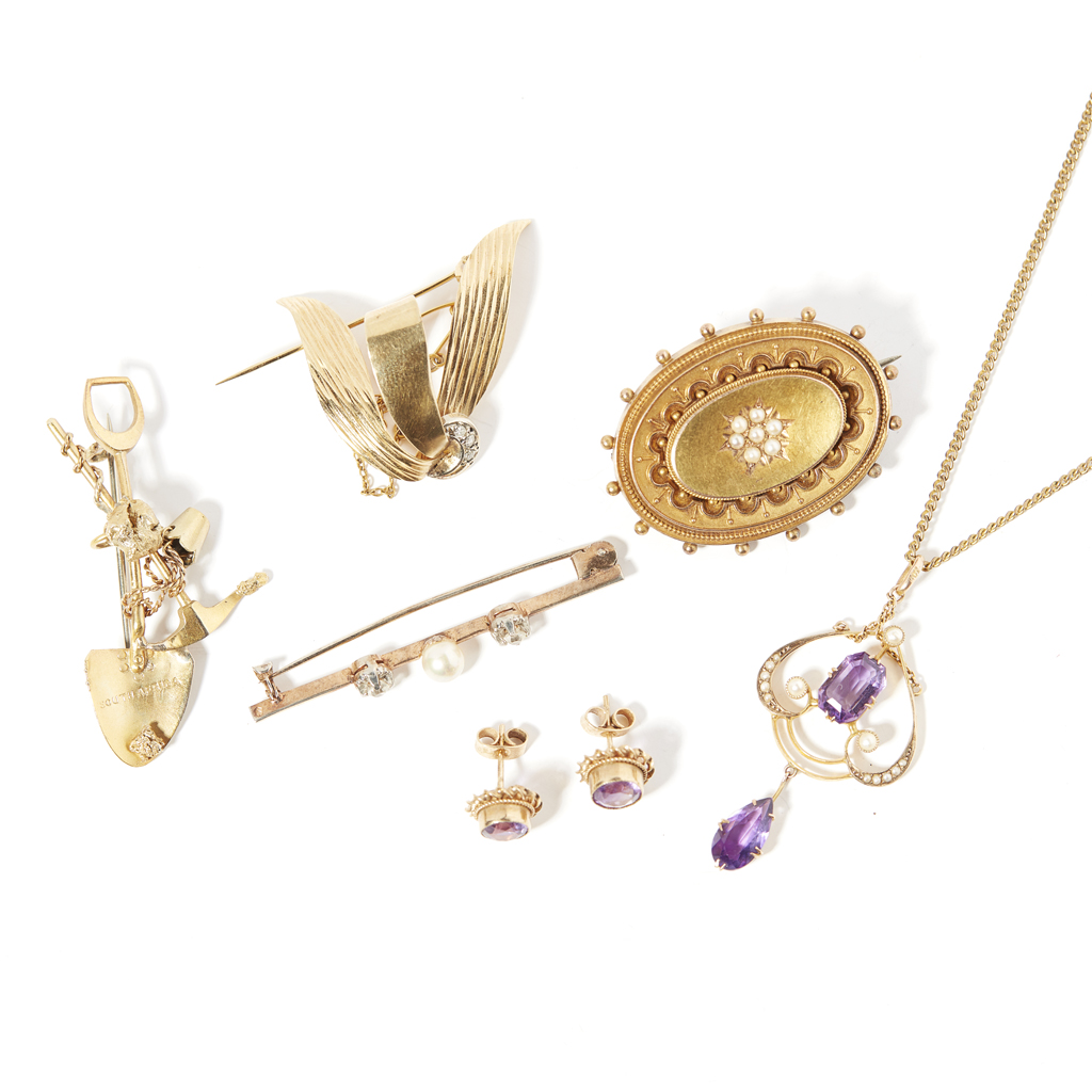 to include a pair of 9ct gold amethyst set ear studs, an Edwardian amethyst and seed pearl set pendant necklace, stamped 9ct; a Victorian 9ct gold seed pearl set brooch, a 9ct gold and diamond set brooch; two further bar brooches (6)