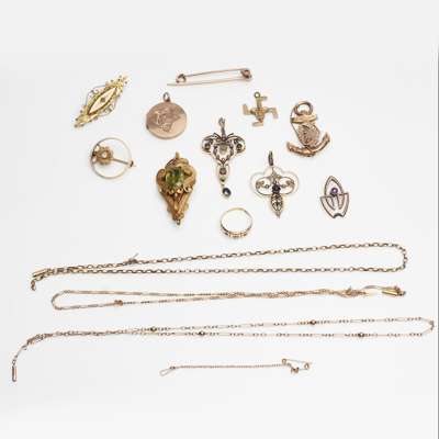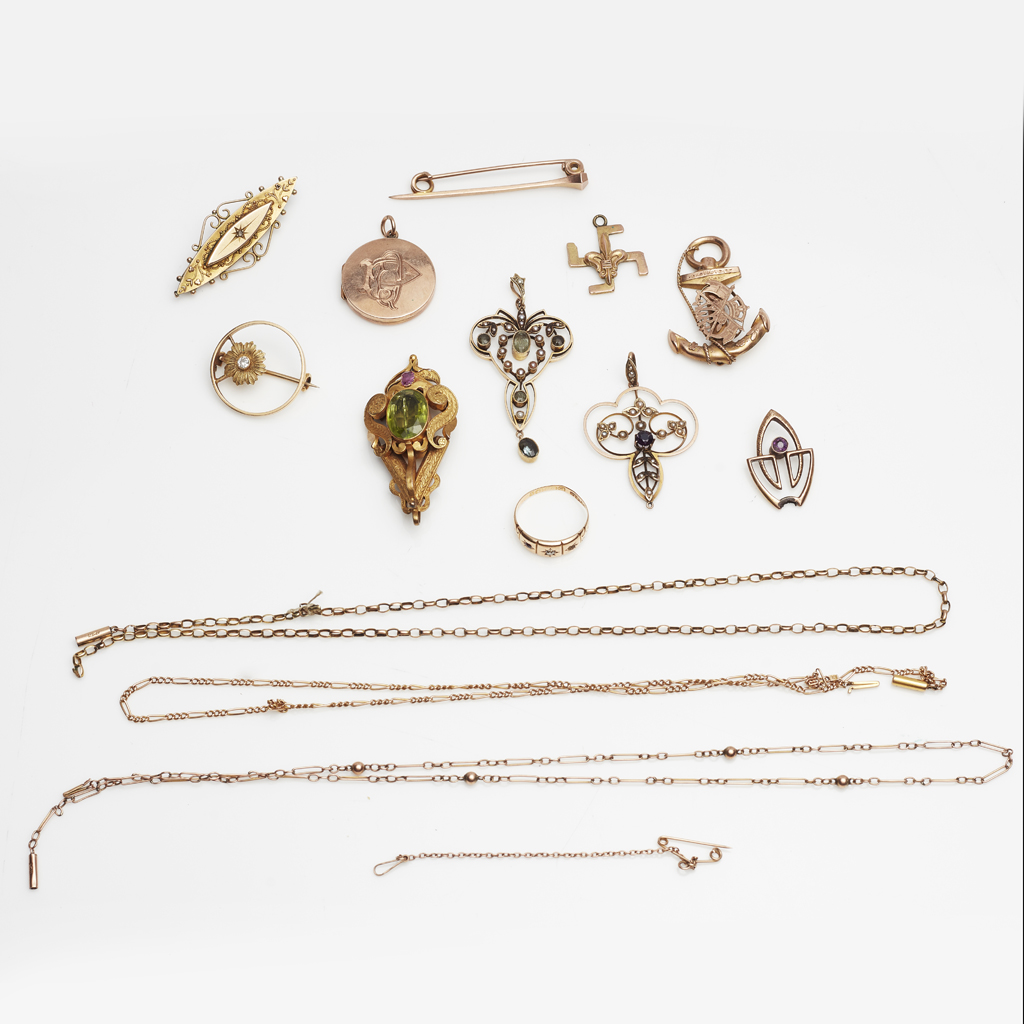 to include a 9ct gold locket, a 9ct gold anchor pendant; a 9ct gold Victorian brooch and 15ct gold ruby and diamond set ring; together with three gem set pendants, three neck chains, stamped 9c or 15c; various brooches, pendants etc. (qty)