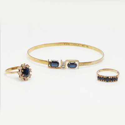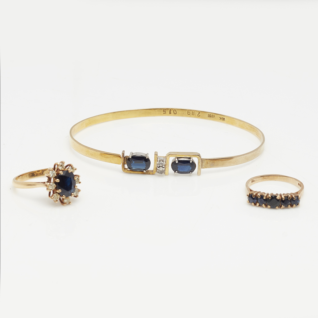 to include a 9ct gold five stone sapphire ring, an 18ct gold sapphire and diamond cluster ring and a modern sapphire and diamond set bangle, stamped 750 (3)