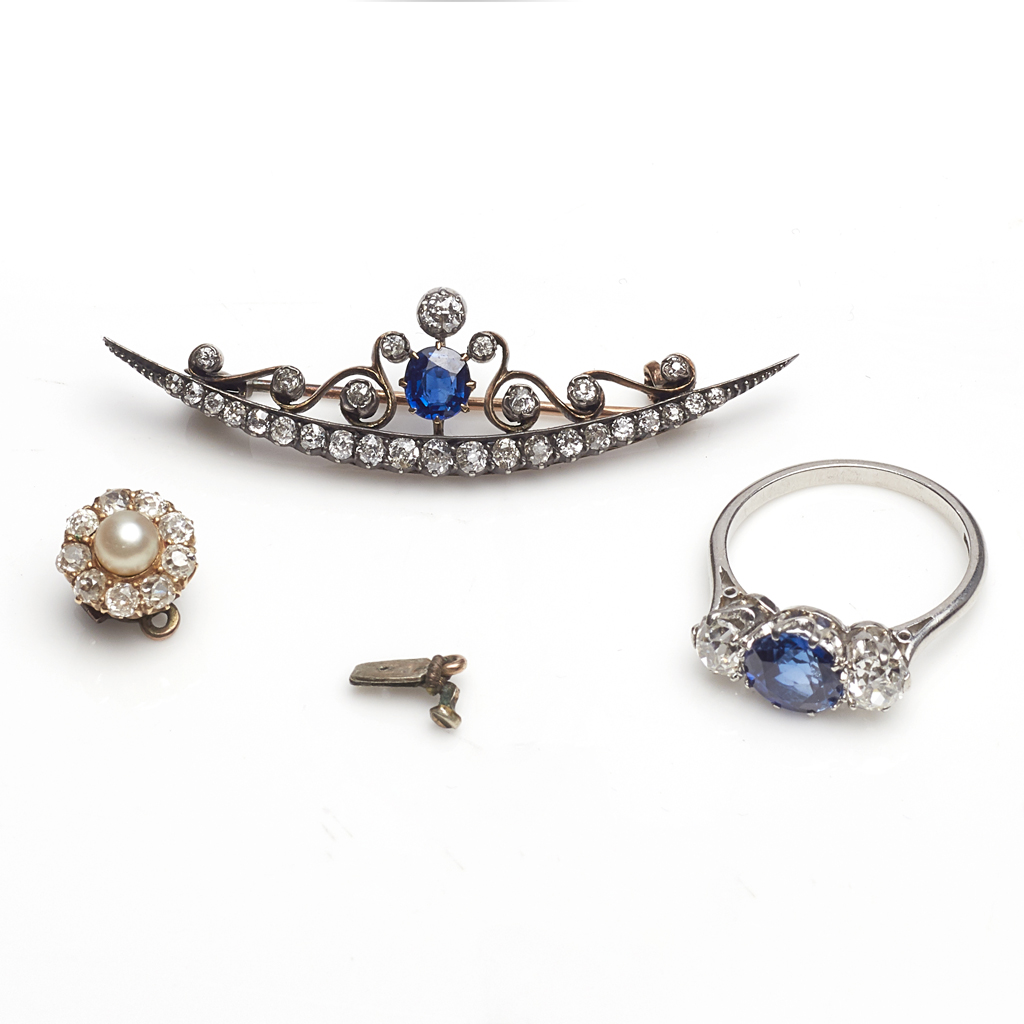 to include a synthetic sapphire and diamond set three stone ring, to a plain white metal shank, stamped PLAT; a Victorian sapphire and diamond set crescent brooch; a pearl and old round-cut diamond set cluster clasp (3)