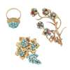 to include a turquoise set cluster ring, stamped 750; a turquoise set floral cluster brooch, stamped 750; a novelty brooch modelled as a monkey in branches, set with en tremblant turquoise and gem set clusters, indistinct marks (3)