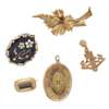 to include a Victorian enamel and seed pearl set mourning brooch; a mid 20th-century diamond set floral brooch, stamped 750; an oval Victorian rose-cut diamond set pendant, unmarked; a small early 19th-century mourning brooch, a 9ct gold regimental brooch (5)