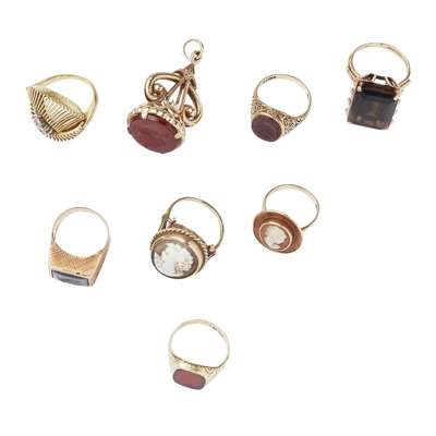 to include a 9ct gold agate set signet ring, two 9ct gold cameo rings and a 9ct gold agate set fob; a smokey quartz set cocktail ring, unmarked; a mid-century three stone diamond ring, unmarked; an agate set signet ring, stamped 585; and a yellow metal signet ring (8)