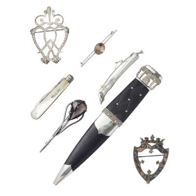 to include a silver luckenbooth brooch, Edinburgh 1987 also stamped TAIN; another set with hardstones and Victorian diamond registration mark to reverse; a silver and smokey quartz set brooch and a citrine set bar brooch; a brooch modelled as a deer's foot; a silver and mother of pearl pocket knife in a leather pouch and a modern silver and citrine mounted sgian dubh (7)
