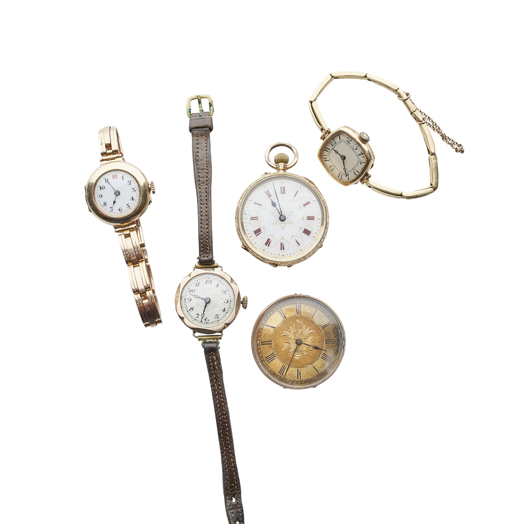 A mixed group of two pocket watches and three wrist watches