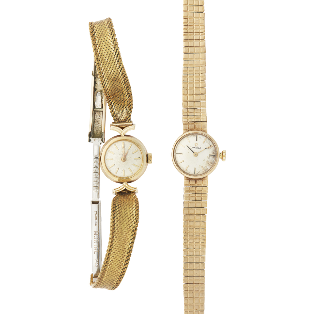 the small round dial with baton indicators, plain case, integral flexible gold brick link bracelet, fold over clasp; together with a lady's 9ct gold cased wrist watch, Tissot, the round champagne dial with slight texturing, baton indicators, with yellow metal tapered mesh link bracelet, adjustable clasp (2)