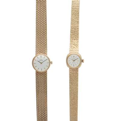 small off white dial, baton indicators, integral textured bracelet, fold over clasp, manual movement; together with a lady's 9ct gold Omega wrist watch, satin silvered dial, baton numerals, woven mesh link integral bracelet, fold over clasp, manual movement, ref. 620, the rear covers on both engraved and dated, all in one Rolex box and cardboard box (2)