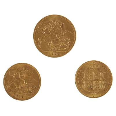 Sovereign, 1928, SA; half sovereigns, 1878, shield, YH, 1910 (3)